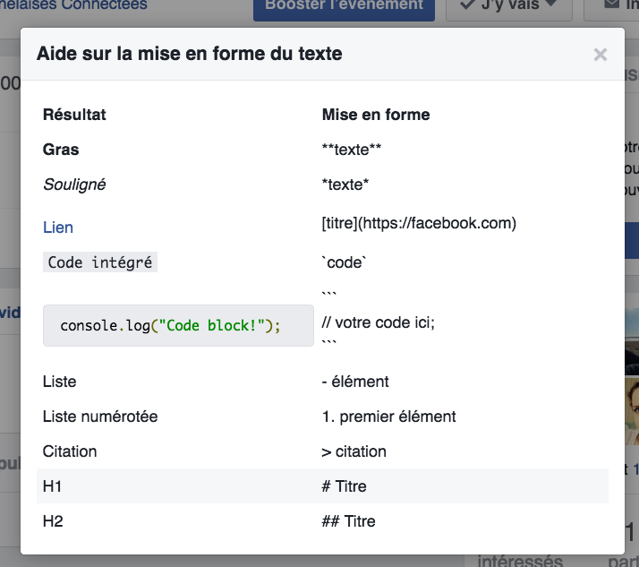 Gardez dans votre bloc note ce petit tableau de mise en forme des caractères (vous pouvez faire un copier coller depuis cet article) car l’aide sur la mise en forme n’est visible qu’après avoir cliqué sur le lien (qui n’est plus disponible quand vous modifiez une publication).